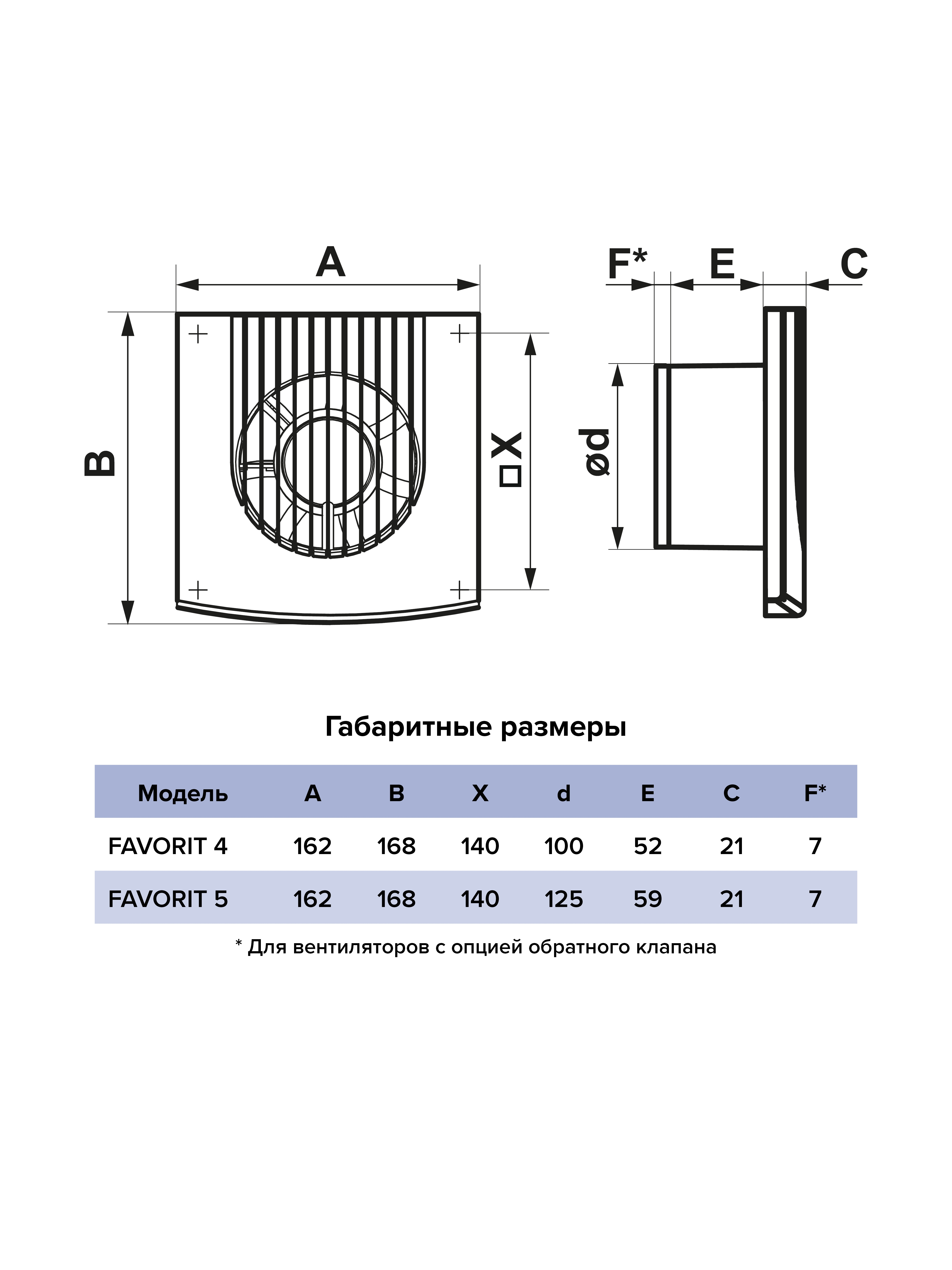 Независимо от диаметра фланца в различных моделях серии FAVORITE габаритные размеры вентиляторов не меняются.